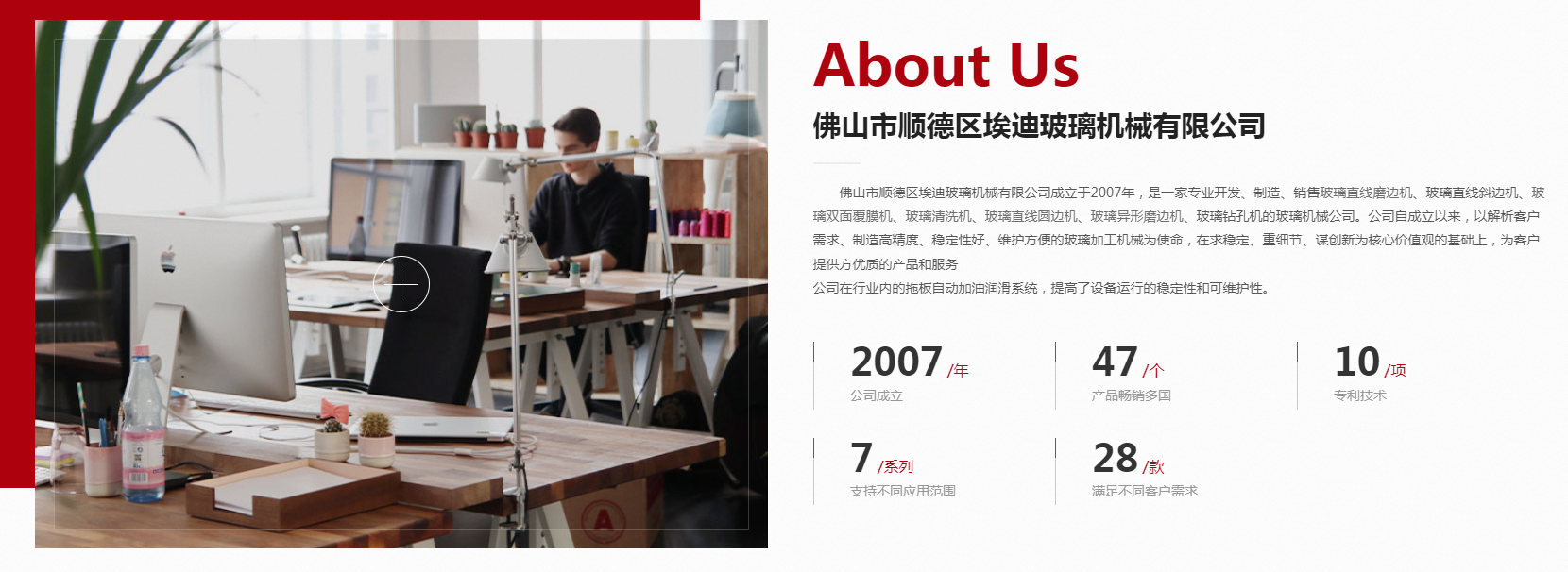 佛山市順德區(qū)埃迪玻璃機(jī)械有限公司成立于2007年,是一家專業(yè)開發(fā)、制造、銷售玻璃直線磨邊機(jī)、玻璃直線斜邊機(jī)、玻璃雙面覆膜機(jī)、玻璃清洗機(jī)、玻璃直線圓邊機(jī)、玻璃異形磨邊機(jī)、玻璃鉆孔機(jī)的玻璃機(jī)械公司。公司自成立以來,以解析客戶需求、制造高精度、穩(wěn)定性好、維護(hù)方便的玻璃加工機(jī)械為使命,在求穩(wěn)定、重細(xì)節(jié)、謀創(chuàng)新為核心價值觀的基礎(chǔ)上,為客戶提供產(chǎn)品和服務(wù)
