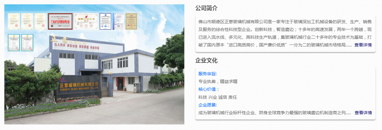 佛山市順德區(qū)正意玻璃機(jī)械有限公司是一家專注于玻璃深加工機(jī)械設(shè)備的研發(fā)、生產(chǎn)、銷售及服務(wù)的高新技術(shù)企業(yè)。創(chuàng)新科技,智造磨邊;十多年的高速發(fā)展,兩年一個(gè)跨越,現(xiàn)已進(jìn)入流水線、多元化、高科技生產(chǎn)軌道,集玻璃機(jī)械行業(yè)二十多年的專業(yè)技術(shù)為基礎(chǔ),打破了國內(nèi)原本“進(jìn)口高質(zhì)高價(jià),國產(chǎn)廉價(jià)低質(zhì)”一分為二的玻璃機(jī)械市場(chǎng)格局。在國內(nèi)玻璃機(jī)械市場(chǎng),正意保持著關(guān)注度和產(chǎn)銷量,并且在海外也取得了不錯(cuò)的成績(jī)。
