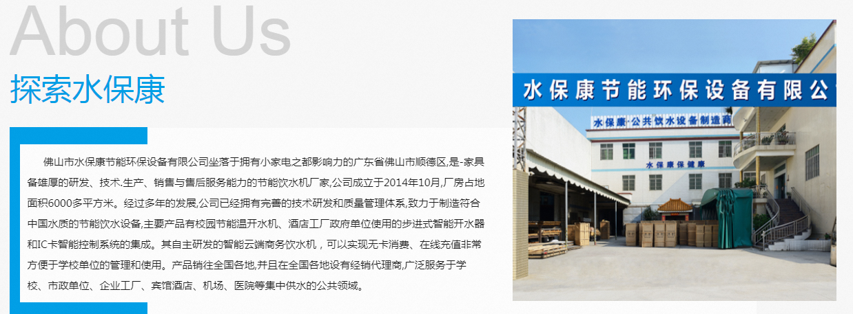 佛山市水??倒?jié)能設(shè)備有限公司坐落于擁有小家電之都影響力的廣東省佛山市順德區(qū),是-家具備雄厚的研發(fā)、技術(shù).生產(chǎn)、銷售與售后服務(wù)能力的節(jié)能飲水機(jī)廠家,公司成立于2014年10月,廠房占地面積6000多平方米。經(jīng)過(guò)多年的發(fā)展,公司已經(jīng)擁有完善的技術(shù)研發(fā)和質(zhì)量管理體系,致力于制造符合國(guó)人水質(zhì)的節(jié)能飲水設(shè)備,主要產(chǎn)品有校園節(jié)能溫開水機(jī)、酒店工廠政府單位使用的步進(jìn)式智能開水器和IC卡智能控制系統(tǒng)的集成。其自主研發(fā)的智能云端商務(wù)飲水機(jī),可以實(shí)現(xiàn)無(wú)卡消費(fèi)、在線充值非常方便于學(xué)校單位的管理和使用。產(chǎn)品銷往各地,并且在各地設(shè)有經(jīng)銷代理商,廣泛服務(wù)于學(xué)校、市政單位、企業(yè)工廠、賓館酒店、機(jī)場(chǎng)、醫(yī)院等集中供水的公共領(lǐng)域。
