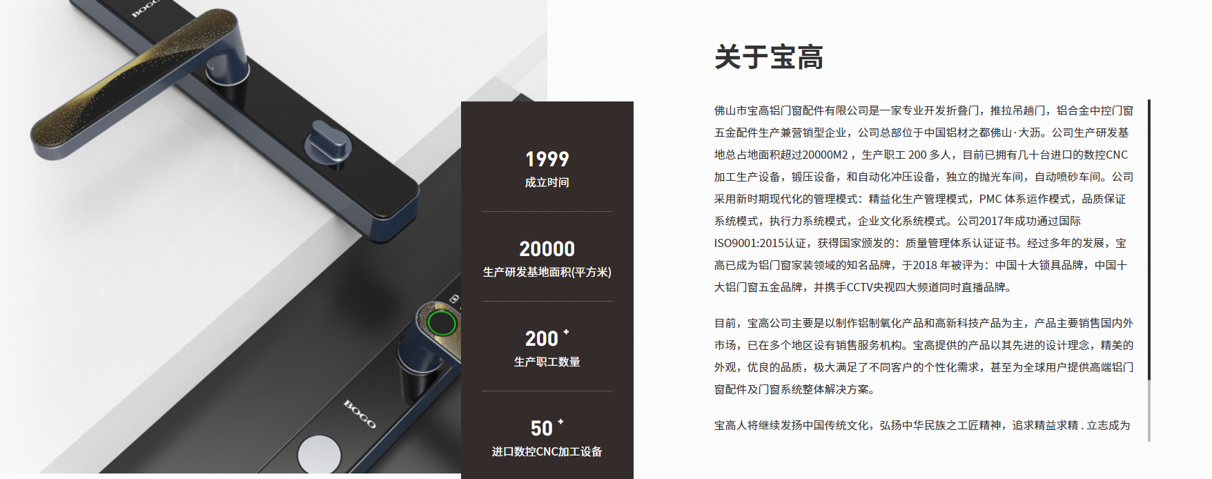 佛山市寶高鋁門窗配件有限公司是一家專業(yè)開發(fā)折疊門,推拉吊趟門,鋁合金中控門窗五金配件生產兼營銷型企業(yè),公司總部位于鋁材之都佛山·大瀝。公司生產研發(fā)基地總占地面積超過20000M2 ,生產職工 200 多人,目前已擁有幾十臺進口的數(shù)控CNC加工生產設備,鍛壓設備,和自動化沖壓設備,獨立的拋光車間,自動噴砂車間。公司采用新時期現(xiàn)代化的管理模式:精益化生產管理模式,PMC 體系運作模式,系統(tǒng)模式,執(zhí)行力系統(tǒng)模式,企業(yè)文化系統(tǒng)模式。公司2017年成功通過 ISO9001:2015認證,獲得頒發(fā)的:質量管理體系認證證書。經過多年的發(fā)展,寶高已成為鋁門窗家裝領域的品牌,于2018 年被評為:十大鎖具品牌,十大鋁門窗五金品牌,并攜手四大頻道同時直播品牌。