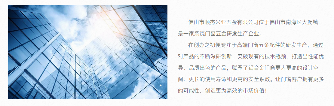 佛山市順杰米亞五金有限公司位于佛山市南海區(qū)大瀝鎮(zhèn),是一家系統(tǒng)門窗五金研發(fā)生產(chǎn)企業(yè)。