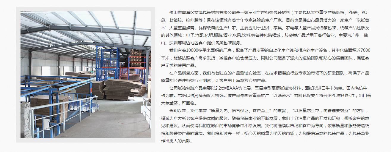 佛山市南海文博包裝材料有限公司(佛山文博紙箱廠)是一家專業(yè)生產(chǎn)大型重產(chǎn)品紙箱包裝的生產(chǎn)廠家。服務(wù)熱線:186-8880-6259。目前也是佛山市一家生產(chǎn)‘以紙?zhí)婺尽拇笮椭匦图埾渖a(chǎn)廠家。主要涉及領(lǐng)域衛(wèi)浴、家具等產(chǎn)品紙箱包裝。輻射到電子.汽配.化肥.服裝.酒業(yè).水果.飲料.等各種包裝領(lǐng)域。主要為廣州、佛山、深圳等周邊地區(qū)客戶提供各類紙箱包裝產(chǎn)品生產(chǎn)設(shè)計(jì)服務(wù)。