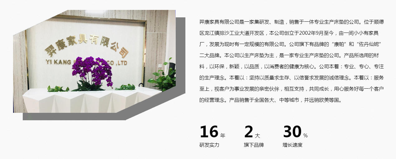 羿康家具有限公司是一家集研發(fā)、制造,銷售于一體專業(yè)生產(chǎn)床墊的公司。位于順德區(qū)龍江鎮(zhèn)排沙工業(yè)大道開發(fā)區(qū),本公司創(chuàng)立于2002年9月至今,由一間小小有家具廠,發(fā)展為現(xiàn)時有規(guī)模的有限公司。公司旗下有品牌的“康帕”和“佐丹仙妮”二品牌。本公司以生產(chǎn)床墊為主,是一家專業(yè)生產(chǎn)床墊的公司。產(chǎn)品所選用的材料,以新穎,以品質(zhì),以消費(fèi)者的健康為核心。公司本著:專業(yè)、專心、專注的生產(chǎn)理念。本著以:堅持以質(zhì)量求生存、以信譽(yù)求發(fā)展的誠信理念。本著以:服務(wù)至上,視客戶為事業(yè)發(fā)展的親密伙伴,相互支持,共同成長,用心服務(wù)好每一個客戶的經(jīng)營理念。產(chǎn)品銷售于各大、中等城市,并遠(yuǎn)銷多國。