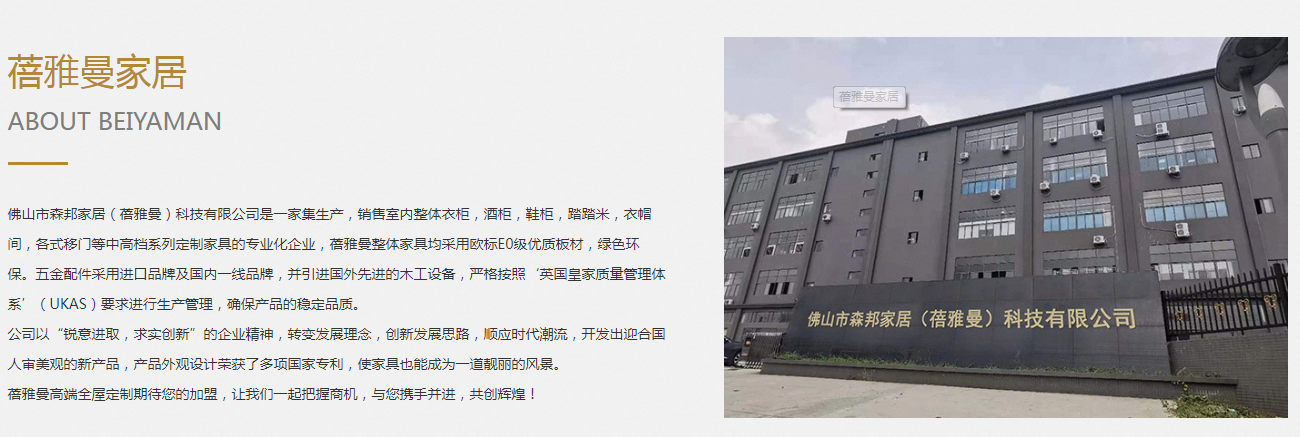 佛山市森邦家居(蓓雅曼)科技有限公司是一家集生產(chǎn),銷售室內(nèi)整體衣柜,酒柜,鞋柜,踏踏米,衣帽間,各式移門等系列定制家具的專業(yè)化企業(yè),蓓雅曼整體家具均采用歐標(biāo)E0級質(zhì)優(yōu)板材。五金配件采用進口品牌及國內(nèi)品牌,并引進國外先進的木工設(shè)備,嚴(yán)格按照(UKAS)要求進行生產(chǎn)管理,確保產(chǎn)品的穩(wěn)定品質(zhì)。