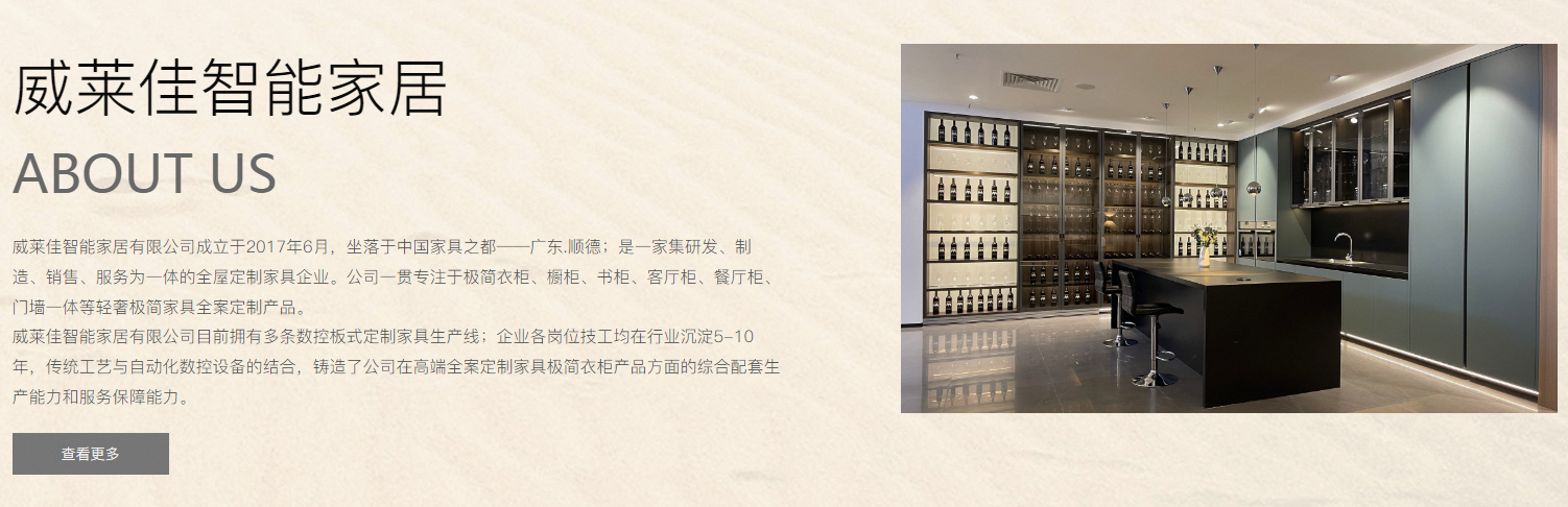 威萊佳智能家居有限公司成立于2017年6月,坐落于家具之都——廣東.順德;是一家集研發(fā)、制造、銷售、服務(wù)為一體的全屋定制家具企業(yè)。公司一貫專注于衣柜、櫥柜、書柜、客廳柜、餐廳柜、門墻一體等輕奢家具全案定制產(chǎn)品。