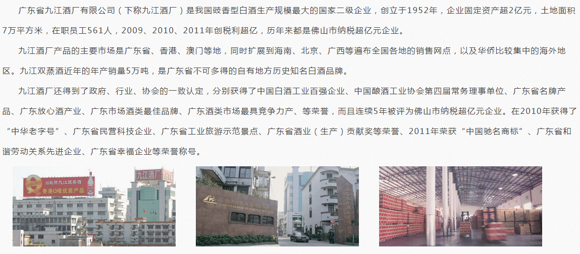 廣東省九江酒廠有限公司(下稱九江酒廠)是我國豉香型白酒生產(chǎn)規(guī)模大的國家二級企業(yè),創(chuàng)立于1952年,企業(yè)固定資產(chǎn)超2億元,土地面積7萬平方米,在職員工561人,2009、2010、2011年創(chuàng)稅利超億,歷年來都是佛山市納稅超億元企業(yè)。
