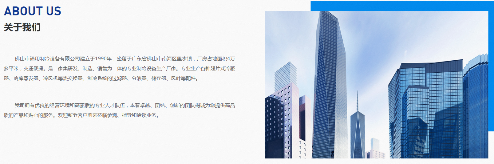 佛山市通用制冷設(shè)備有限公司建立于1990年,坐落于廣東省佛山市南海區(qū)里水鎮(zhèn),廠房占地面積4萬多平米,交通方便。是一家集研發(fā)、制造、銷售為一體的專業(yè)制冷設(shè)備生產(chǎn)廠家。專業(yè)生產(chǎn)各種翅片式冷凝器、冷庫蒸發(fā)器、冷風(fēng)機(jī)等熱交換器、制冷系統(tǒng)的過濾器、分液器、儲存器、風(fēng)葉等配件。
