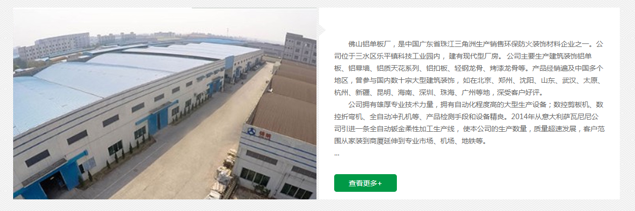 廣東佛山鋁單板廠,是廣東省珠江三角洲生產(chǎn)銷(xiāo)售防火裝飾材料企業(yè)之一。公司位于三水區(qū)樂(lè)平鎮(zhèn)科技工業(yè)園內(nèi),建有現(xiàn)代型廠房。 公司主要生產(chǎn)建筑裝飾鋁單板、鋁幕墻、鋁質(zhì)天花系列、鋁扣板、輕鋼龍骨、烤漆龍骨等。產(chǎn)品經(jīng)銷(xiāo)遍及多個(gè)地區(qū),曾參與國(guó)內(nèi)數(shù)十宗大型建筑裝飾, 如在北京、鄭州、沈陽(yáng)、山東、武漢、太原、杭州、新疆、昆明、海南、深圳、珠海、廣州等地,深受客戶(hù)好評(píng)。