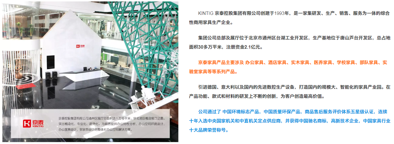 KINTIG 京泰控股集團有限公司創(chuàng)建于1993年,是一家集研發(fā)、生產(chǎn)、銷售、服務為一體的綜合性商用家具生產(chǎn)企業(yè)。