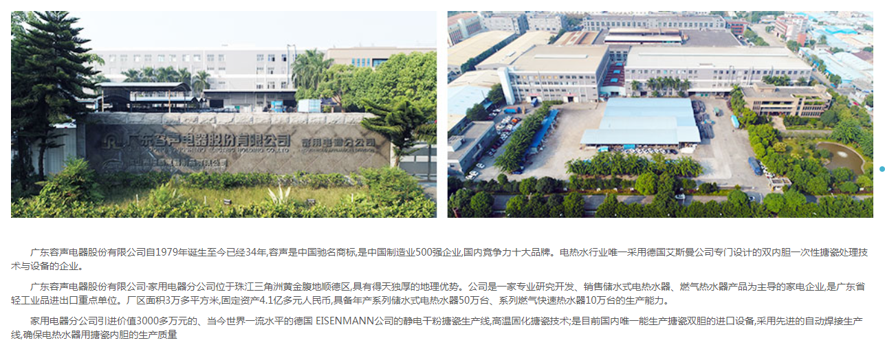 廣東容聲電器股份有限公司·家用電器分公司位于珠江三角洲黃金腹地順德區(qū),具有地理優(yōu)勢。公司是一家專業(yè)研究開發(fā)、銷售儲水式電熱水器、燃?xì)鉄崴鳟a(chǎn)品為主導(dǎo)的家電企業(yè),是廣東省輕工業(yè)品進出口重點單位。廠區(qū)面積3萬多平方米,固定資產(chǎn)4.1億多元人民幣,具備年產(chǎn)系列儲水式電熱水器50萬臺、系列燃?xì)饪焖贌崴?0萬臺的生產(chǎn)能力。
